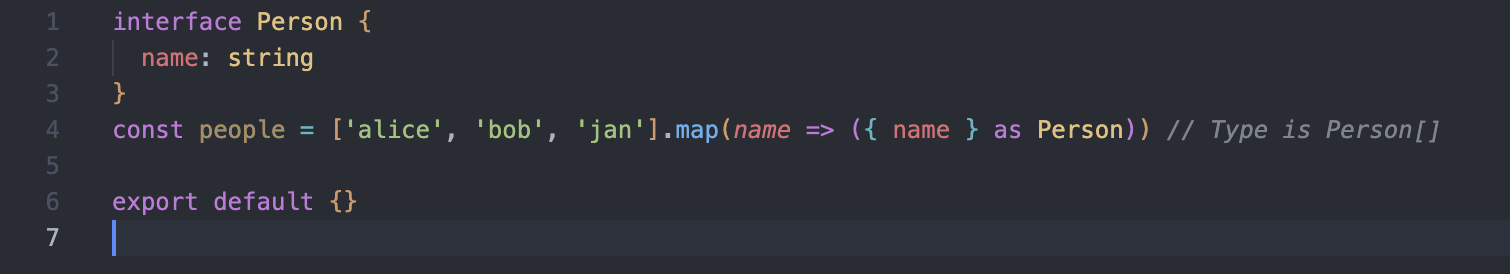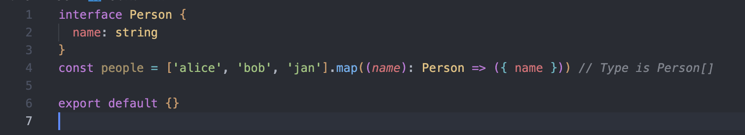 여기서 소괄호는 매우 중요합니다(name):Person 은 name의타입이 없고 반환타입이 Person 이라는것을 명시합니다. 즉 우리는 Person[] 을 반환하고싶은것이기때문에 소괄호가 필요한것입니다.