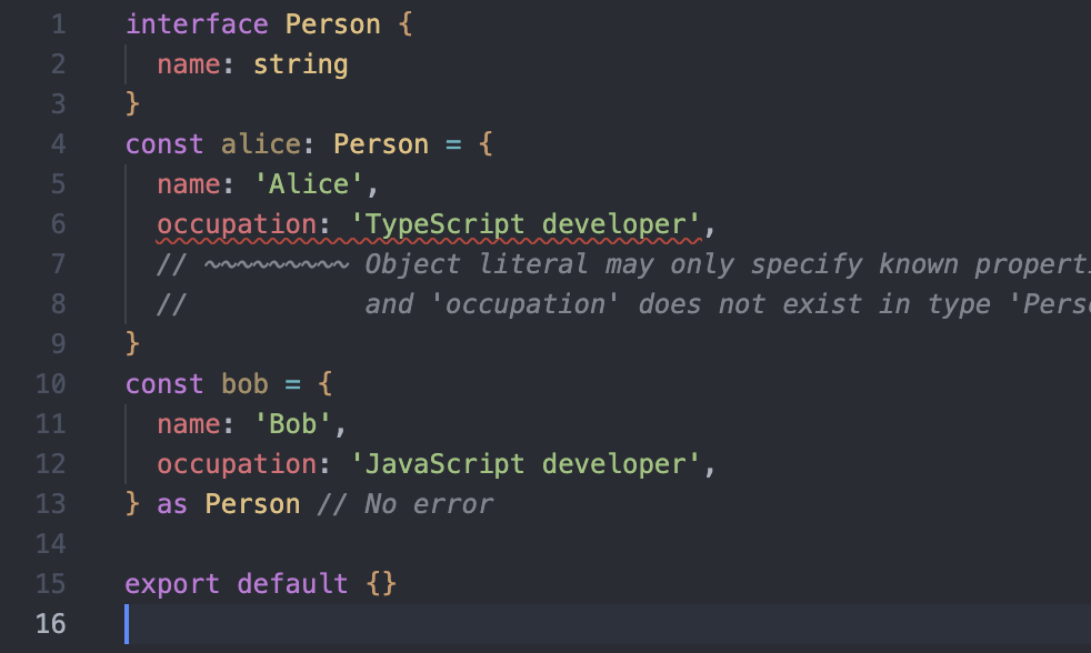 타입 선언은 할당되는 값이 해당 인터페이스를 만족하는지 검사합니다. 따라서 alice변수 는 name 속성이 없다고 타입스크립트가 알려주고있는것을 볼수있습니다.