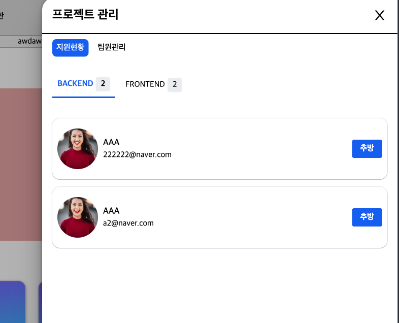 위 사진은 프로젝트에 신청한 지원자 및 프로젝트 팀원을 전체적으로 관리하는 모달 입니다. 첫번째로 지원현황,팀원관리 에 따라 모달의 뷰가 바뀌어야하며 포지션별로도 화면이 바뀌어야하기 때문에 초기 구상당시에는 구현이 약간 어려울지도 모르겠다고 생각이 들었었습니다.
