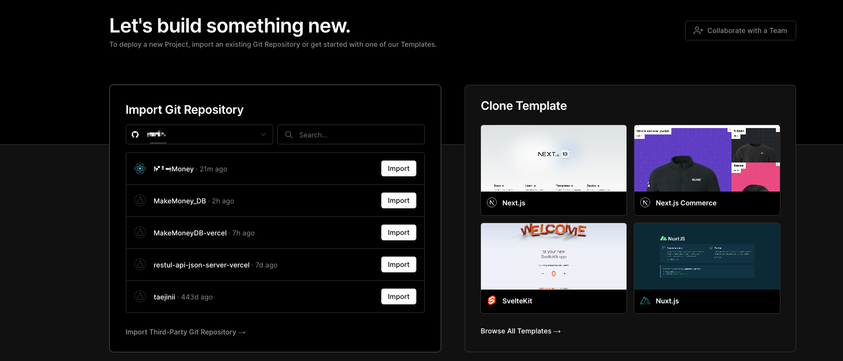 vercel 이란 프론트엔드 호스팅 사이트입니다. 로그인하실떄 깃허브로 로그인하시면 바로 나의 레포지토리와 연동이 가능하기때문에 깃허브로 로그인 하시는걸 추천드립니다 .