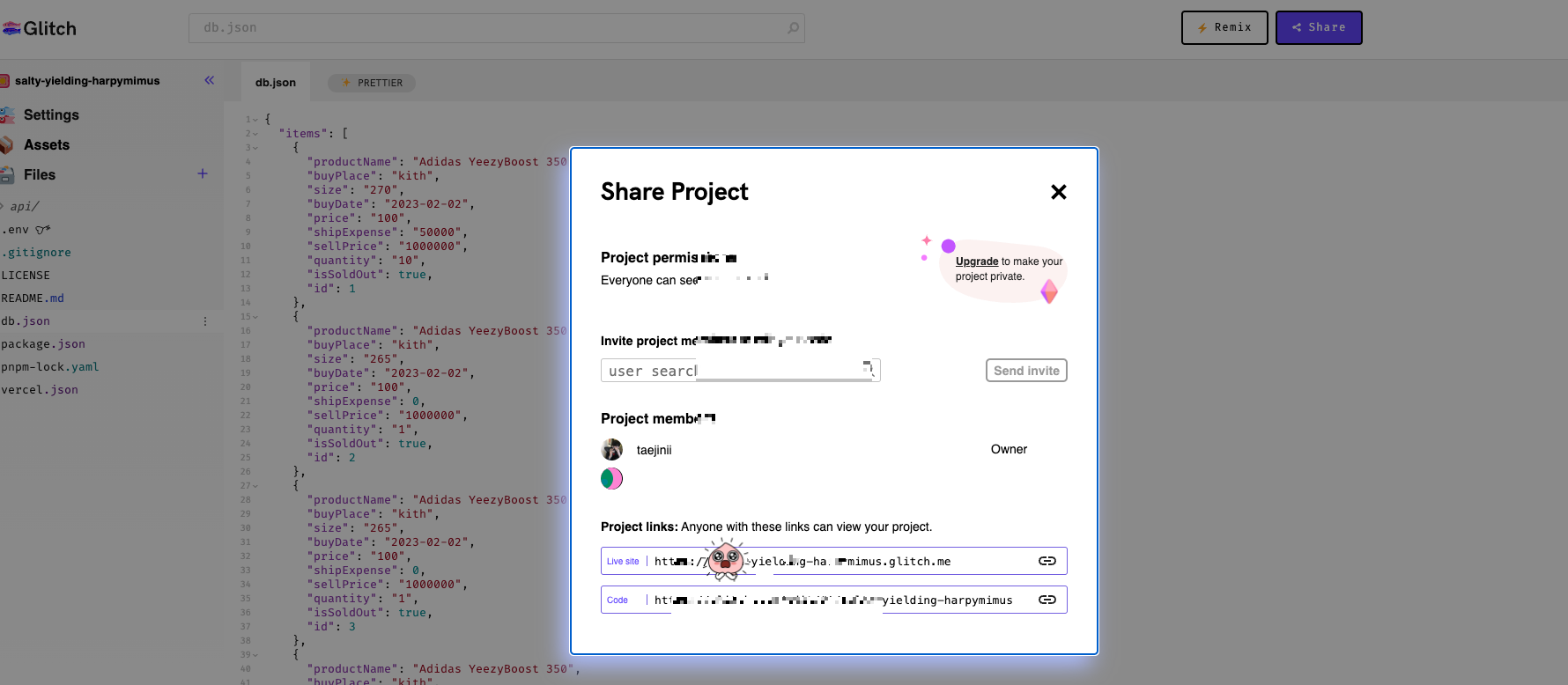 자 이제 백엔드는 끝났습니다 원래라면 json-server 는 로컬에서만 작동되기때문에 배포를 하게된다면 배포된 도메인에선 작동이 되지 않기때문에 glitch 를 활용하여 서버를 배포해주는 것 입니다!